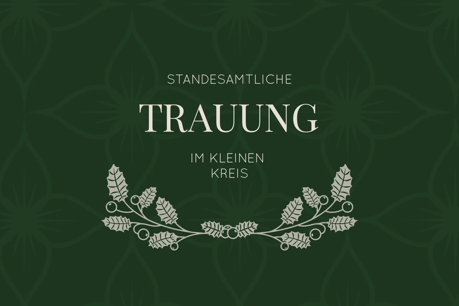 Eine unaufdringliche aber weihnachtlich stimmungsvolle Einladungskarte zur standesamtlichen Trauung im kleinen Kreis. Muster und Winterzweige in weihnachtlichen Grün- und Beigetönen runden den Look der Klappkarte ab.