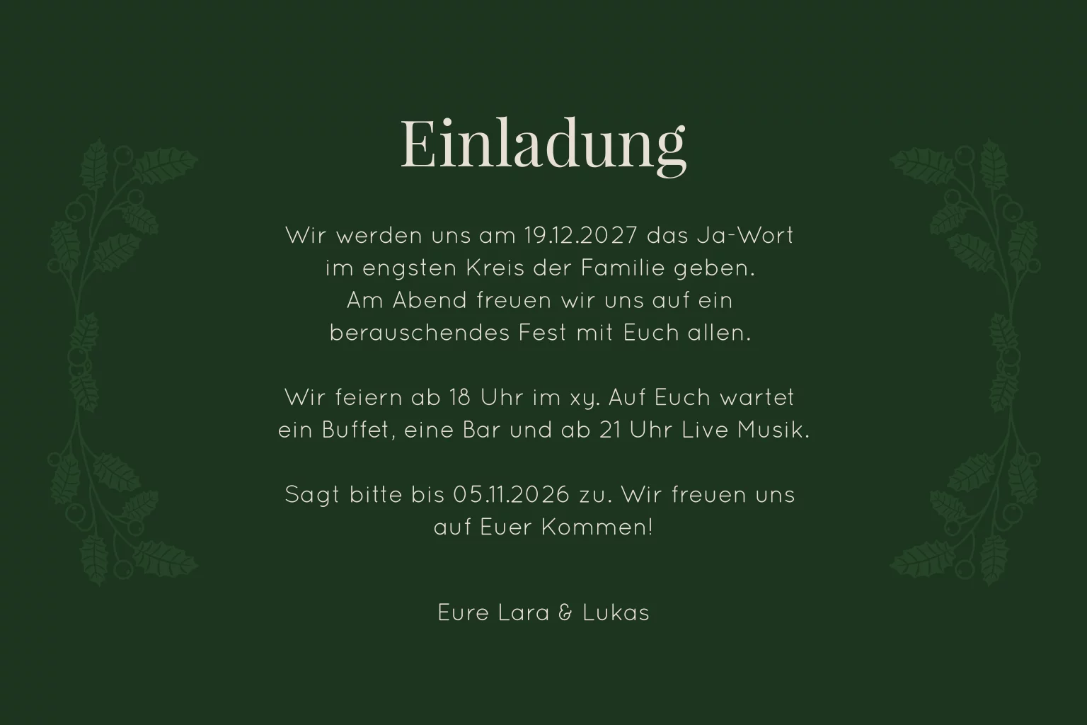 Weihnachtliche Einladung zur standesamtliche Trauung in Grün und Beige