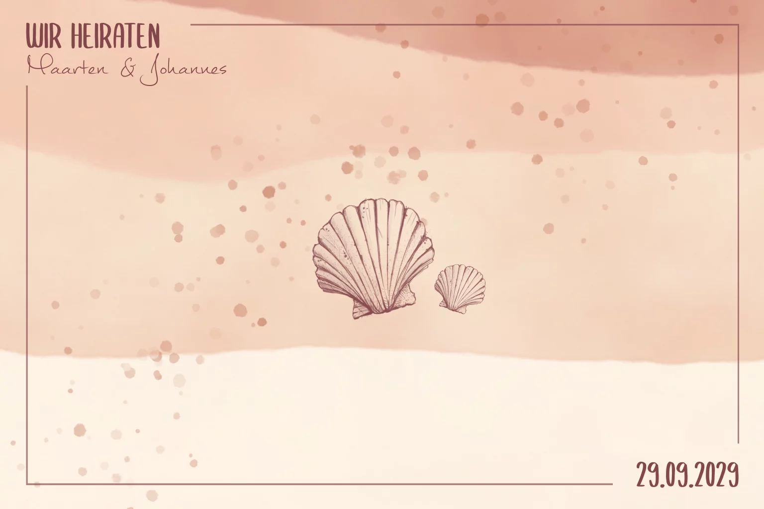 Einladungskarte mit Aquarell Strand Muster und Muscheln. Die Postkarte in Apricot Tönen hat einen zarten Rahmen und Sprenkel. Auf der Rückseite ist Platz für Euer Verlobungsfoto.