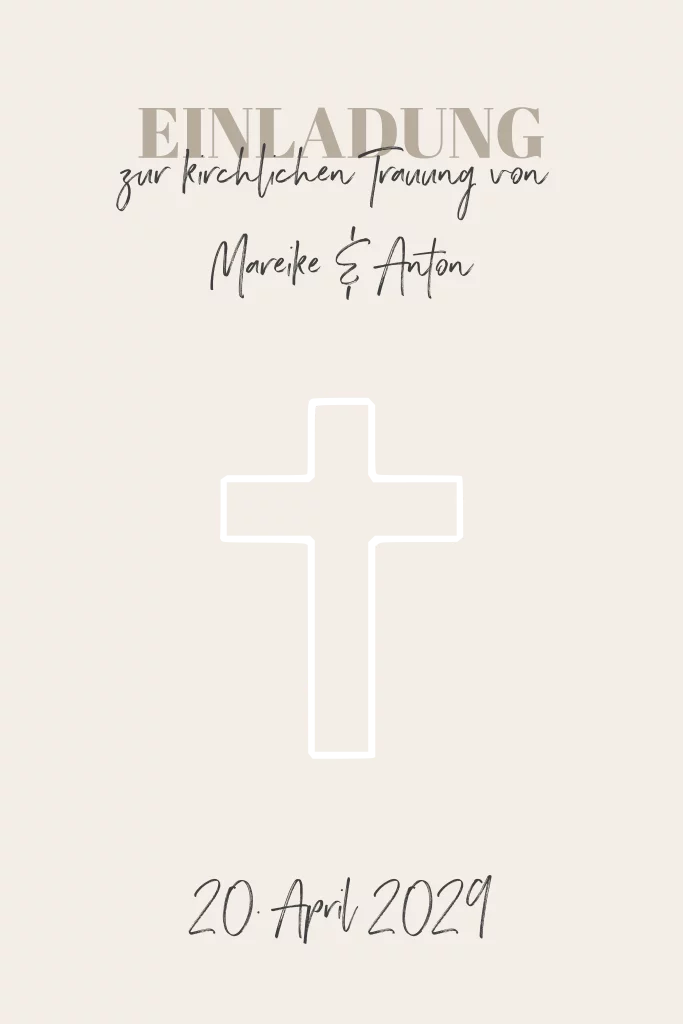 Hochzeitseinladung in beige mit Kreuz und Bibel in Silberfolie