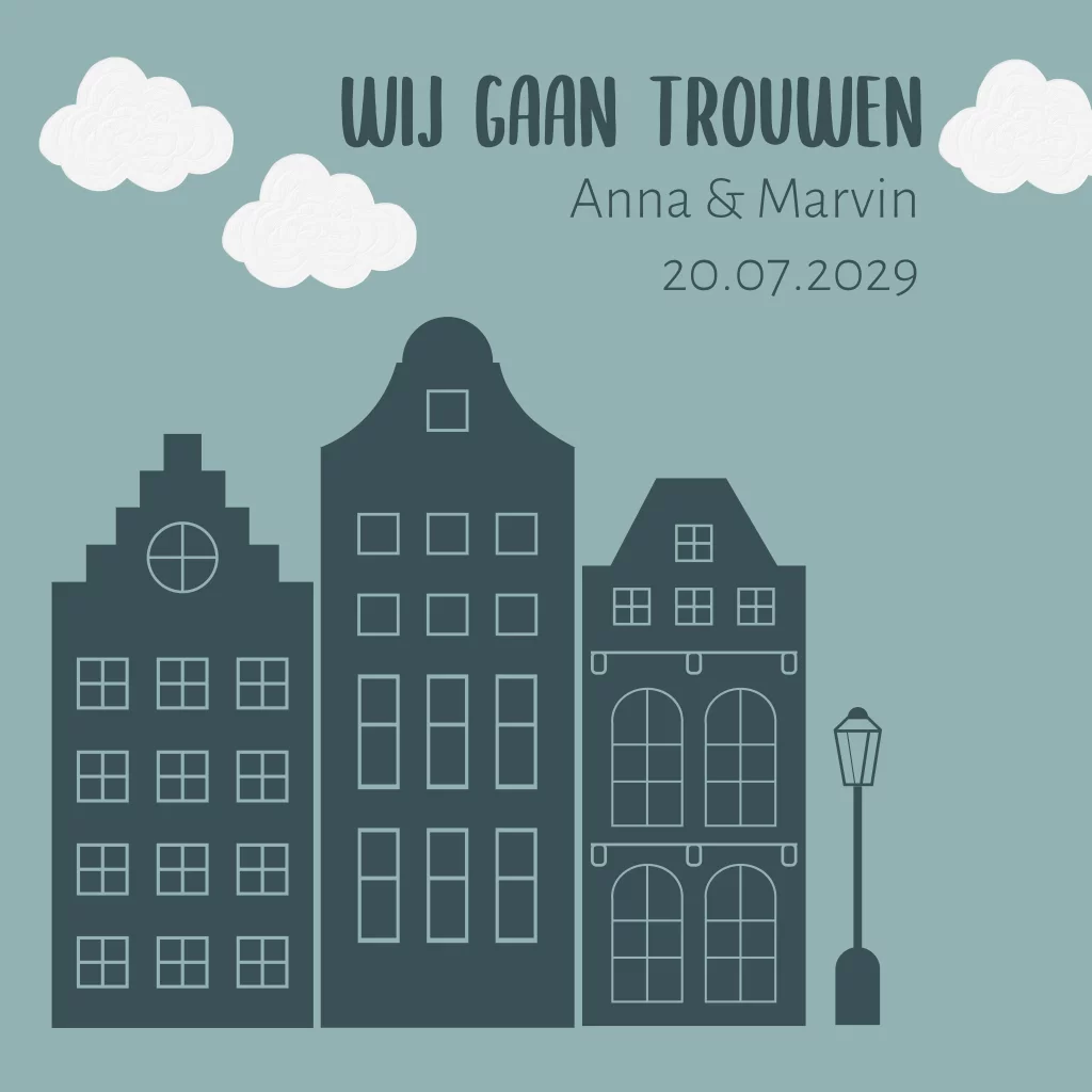 Einladungskarte "Amsterdam" in Blautönen mit weißen Wolken. Die quadratische Einladung zur Hochzeit hat auf der Vorderseite Häuser im typischen niederländischem Design. Die weiße Rückseite der Karte bietet Platz für Euren Einladungstext.