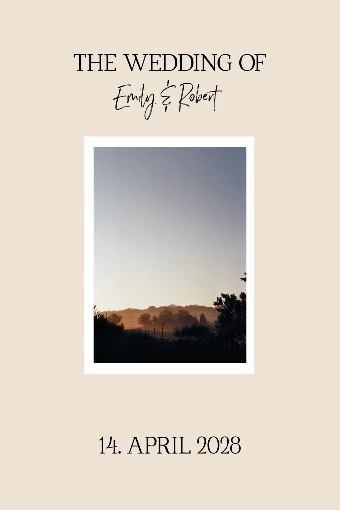 Elegante Einladungskarte zur Hochzeit in beige mit Analogfoto. Das Landschaftsbild im weißen Sofortbilderrahmen gibt der schlichten Karte im Hochformat einen besonderen Touch.