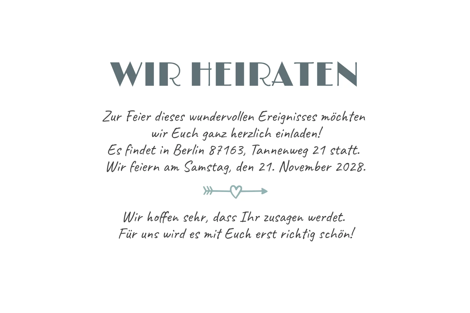 Einladungskarte für Bergliebhaber in blau und weiß mit Herzen, Pfeilen und Banner und Platz für Euer Foto. Die Karte im Postkartenformat ist eine Klappkarte.