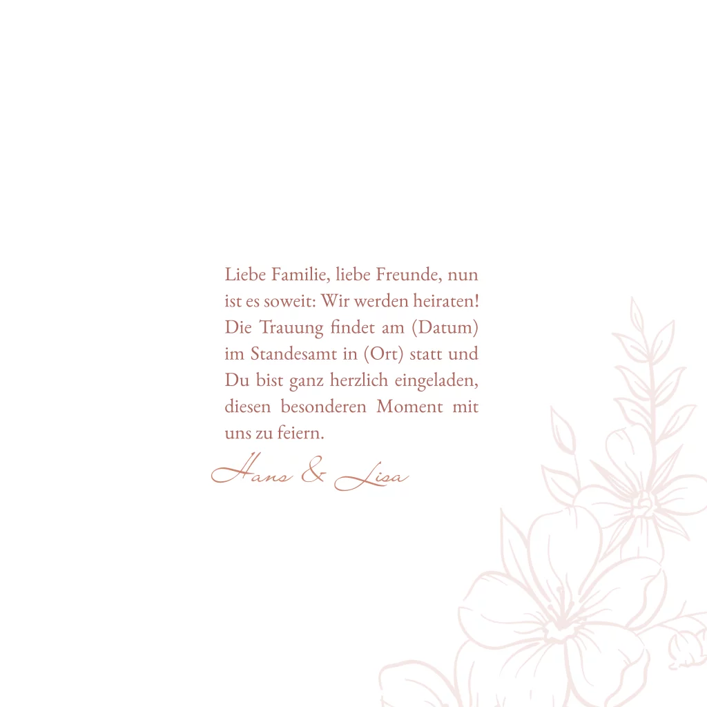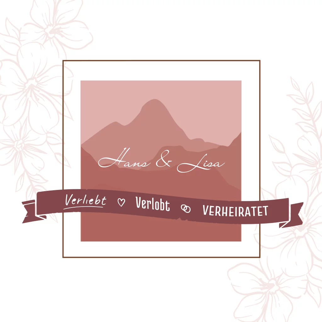 Quadratische weiße Einladungskarte zur Hochzeit mit gerahmten Bergen in rot. Die weiße Klappkarte mit Line Art Blumen und Banner hat auf der Rückseite Platz für Euer Verlobungsfoto.