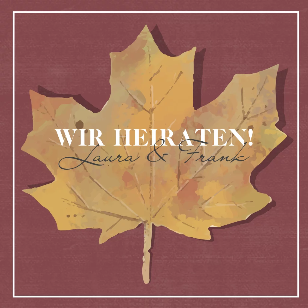 Herbstliche Einladung zur Hochzeit. Die quadratische Karte mit Ahornblatt und Kastanie ist die perfekte Einladungskarte für Eure Herbsthochzeit.