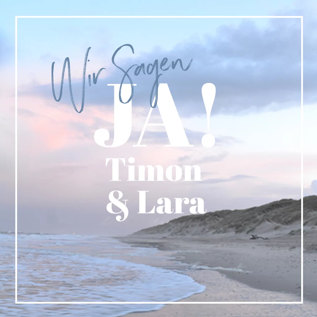 Quadratische Einladungskarte zur Hochzeit mit Hintergrundmotiv Sonnenaufgang am Strand in zarten Farben.