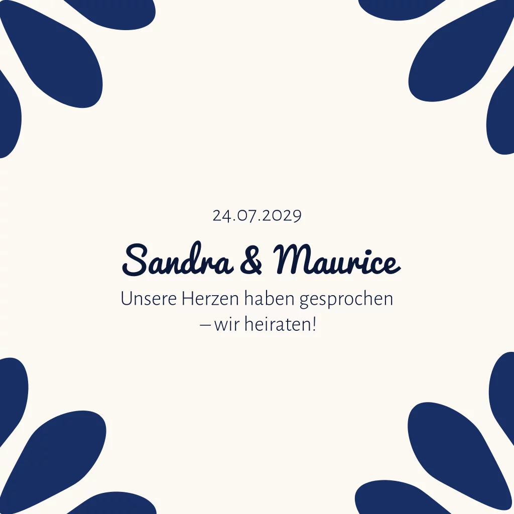 Einfache Einladungskarte zur Hochzeit mit blauen Akzenten. Die quadratische Karte ist auf der Vorderseite beige und auf der Rückseite weiß.