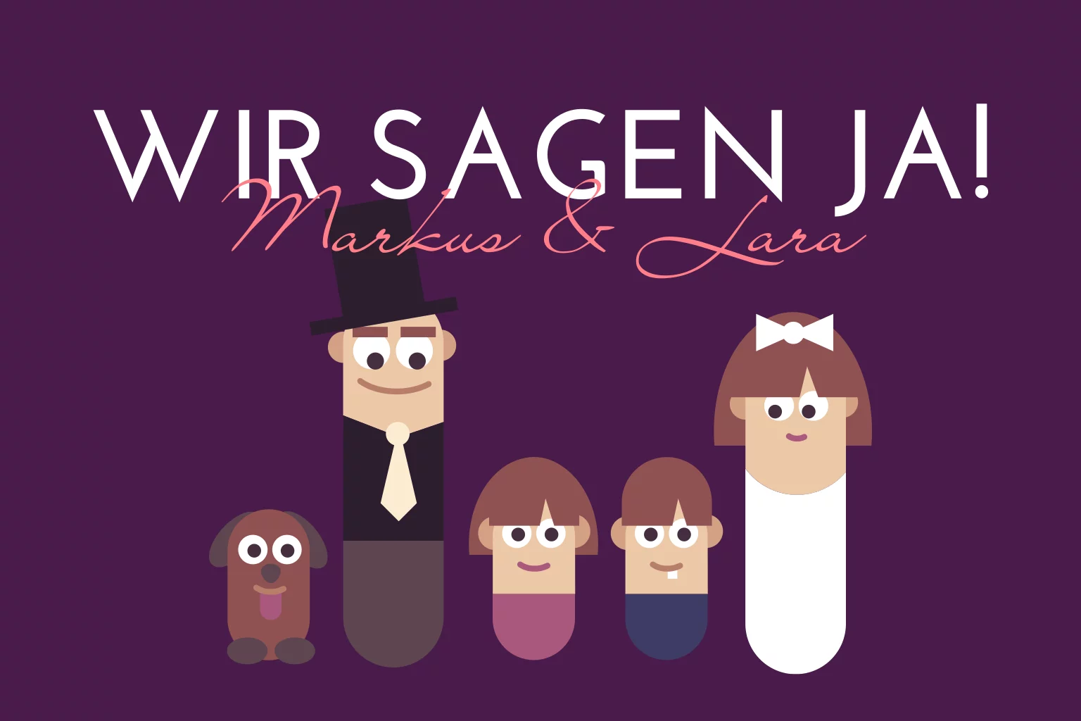 Diese lilafarbene Einladung zur Hochzeit sticht durch die Familie mit Hund Icons hervor. Gerne gestaltet unser Designteam diese Karte mit weniger Kindern oder ohne Hund.