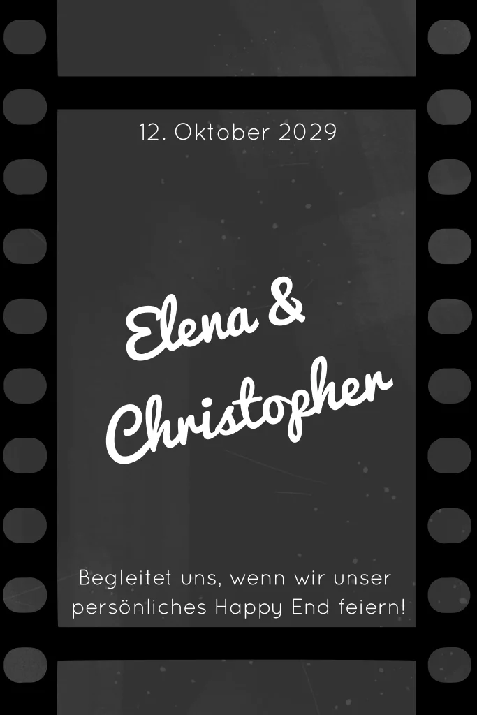 Außergewöhnliche Einladung zur Hochzeit im Film und Kino-Look. Die Karte im Hochformat ist in Schiefertafel Optik gestaltet.