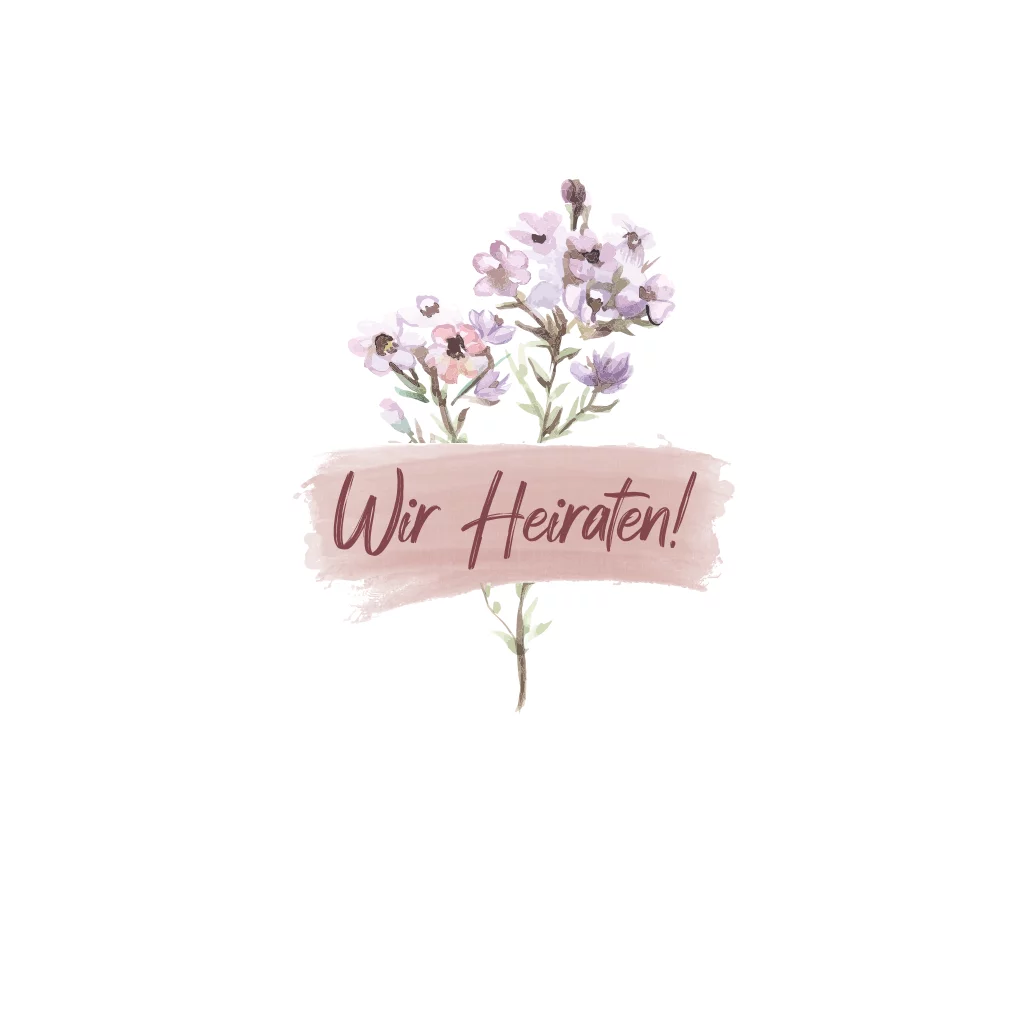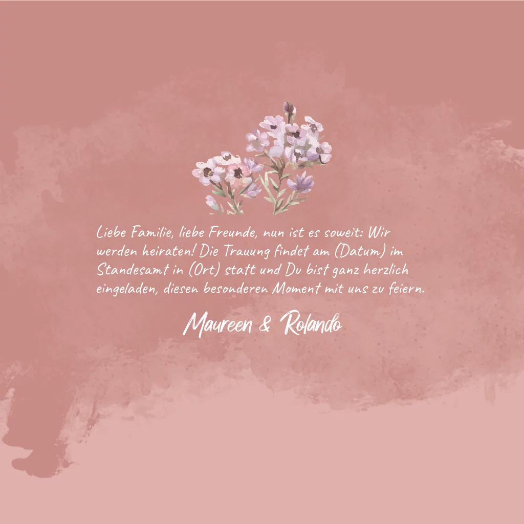 Einladung zur Hochzeit als Klappkarte mit Blüten und Pinselstrich auf der Vorderseite. Die weiße quadratische Karte mit Foto und farbiger Seite im Innenteil bietet ausreichend Platz für Euren Einladungstext und weitere wichtige Informationen.