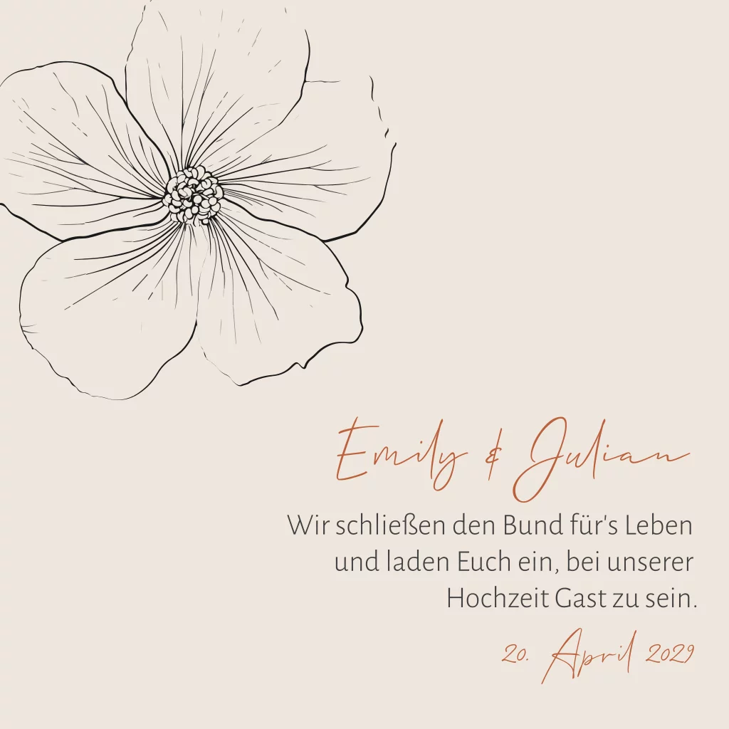 Florale Hochzeitseinladung in beige mit Hibiskus in Line Art