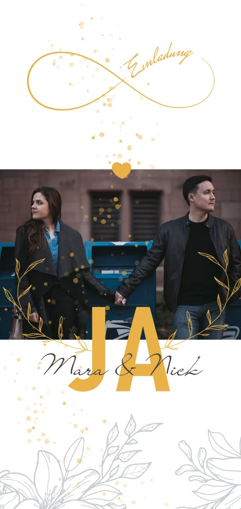 Weiße Einladungskarte zur Hochzeit mit Foto und gelbem Herz. Die Panoramakarte im Hochformat hat zudem ein Unendlichkeitszeichen und ein großes Ja in gelb auf der Vorderseite. Zarte Line Art Blumen zieren sowohl die Vorder- als auch die dunkle Rückseite der Karte.