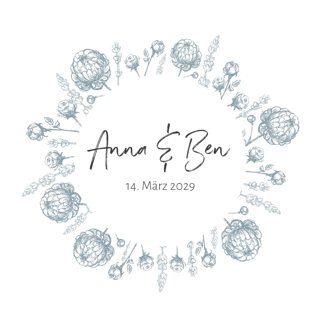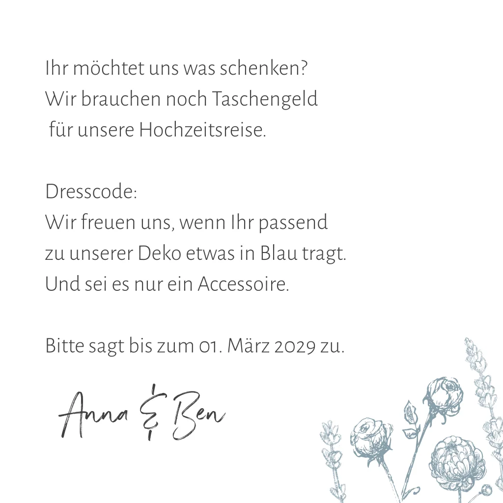 Quadratische Einladung zur Hochzeit mit Blumenskizzen in blau die in einem runden Design angeordnet sind. Die weiße Klappkarte hat ebenfalls Blumen und Lavendel Zeichnungen im Innenteil der Karte.
