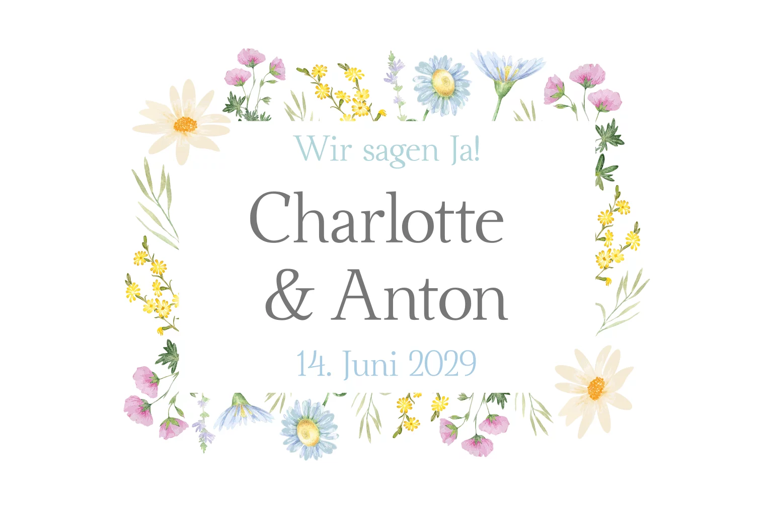 Florale Einladungskarte mit bunten verspielten Blumenrahmen. Die weiße Postkarte hat auf der Rückseite ebenfalls Blumen und ausreichend Platz für Euren Einladungstext.