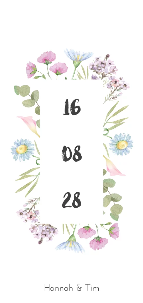 Florale Einladungskarte zur Hochzeit im Hochformat. Die weiße Karte mit bunten Blumen und großem Datum auf der Vorderseite.