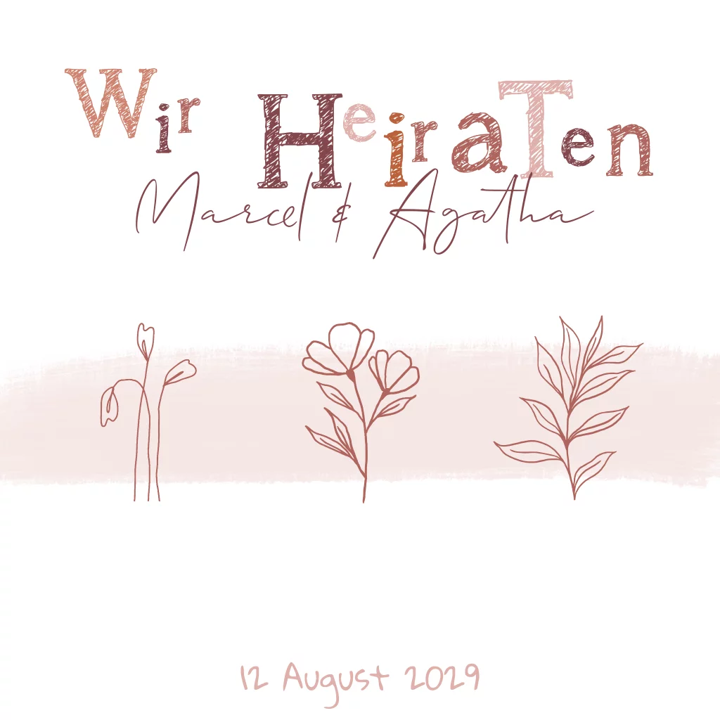 Hochzeitskarte mit floralen Elementen und Pinselstrich Akzenten in rot.