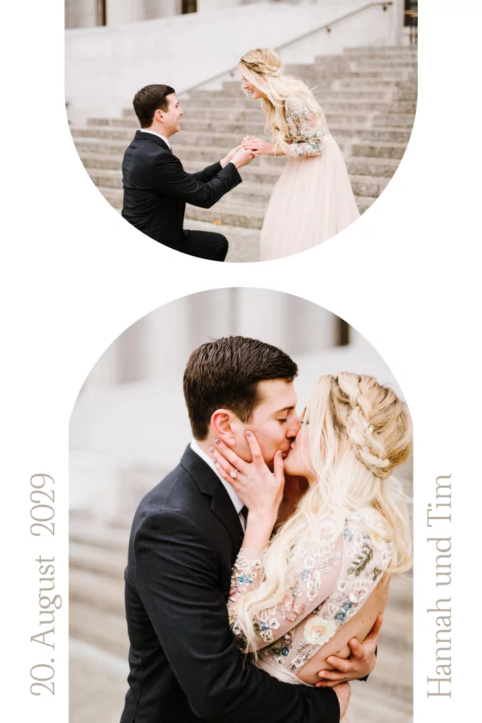 Weiße Einladungskarte zur Hochzeit mit Fotos in Bogenform. Die moderne Postkarte erhält ihre Akzente durch beigefarbene Schrift.