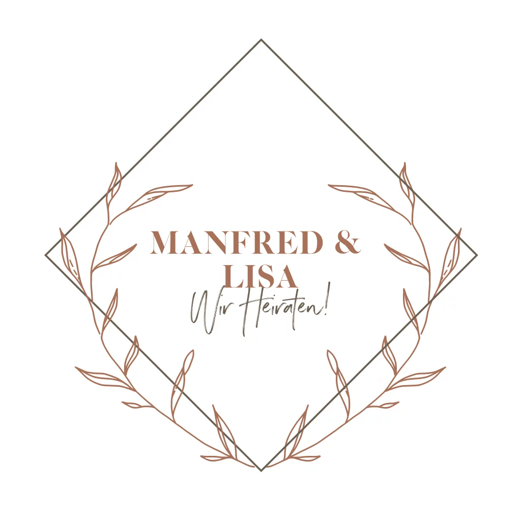 Quadratische Einladungskarte zur Hochzeit. Die helle Karte hat einen braunen geometrischem Rahmen, der von Greenery Zweigen umschlungen wird.