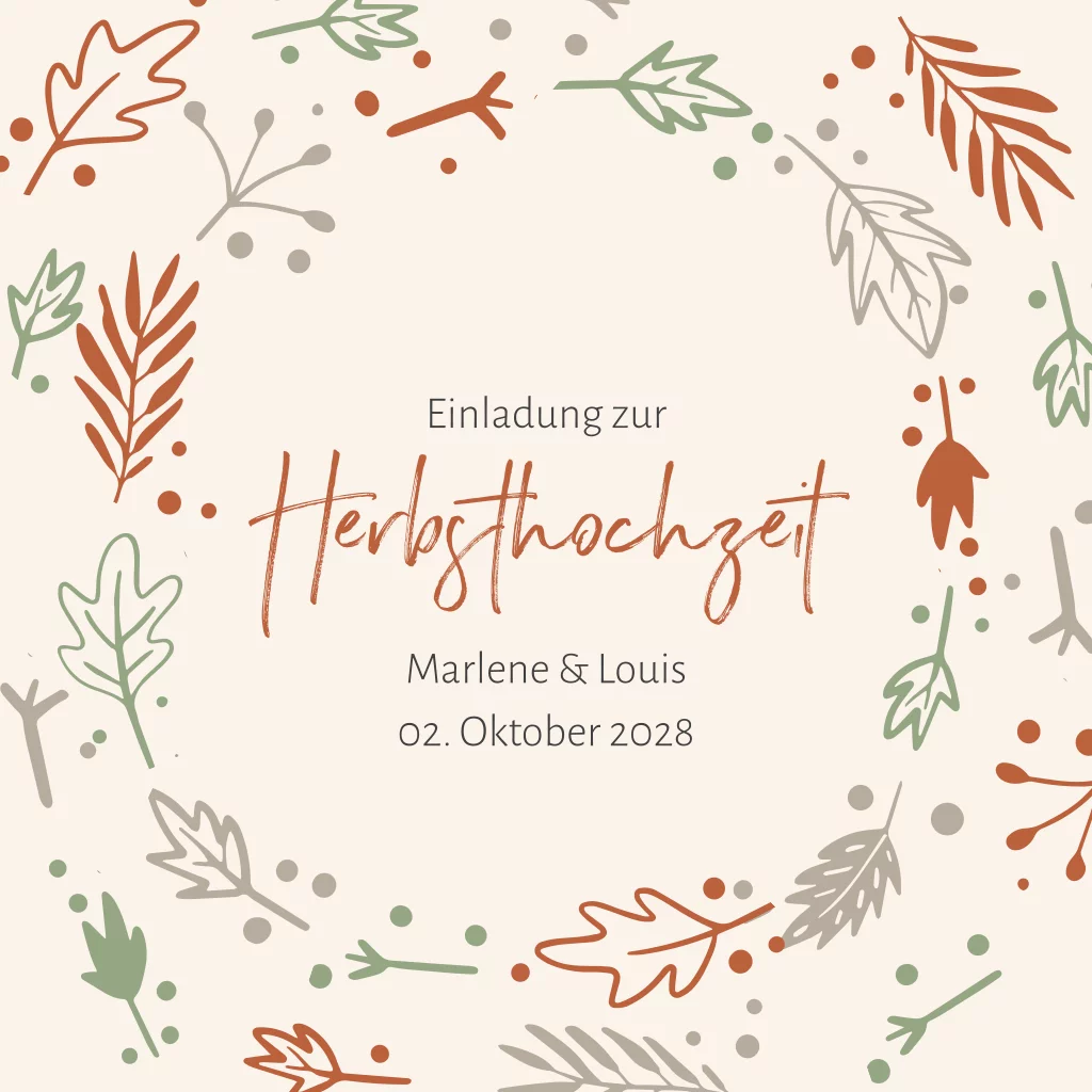 Quadratische Einladungskarte zur Hochzeit mit Blättern auf der Vorderseite in grün und orange. Die Klappkarte in beige mit Timeline im Innenteil der Karte und Icons, wie Hochzeitstorte bietet ausreichend Platz um zu Eurer Herbsthochzeit einzuladen.