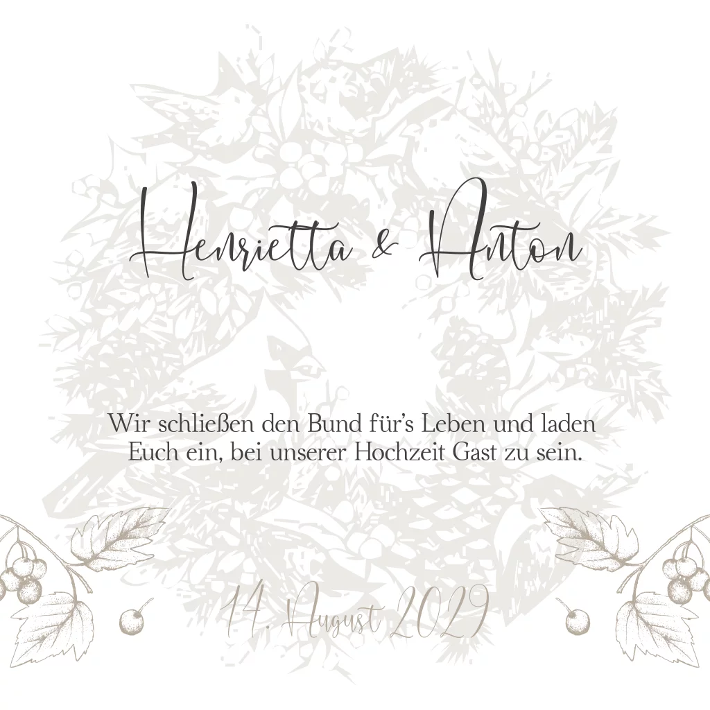 Weiße Einladung zur Hochzeit mit herbstlichen Kranz aus Blättern und Vögeln. Die quadratische Karte hat zudem Blätterzeichnungen in beige.