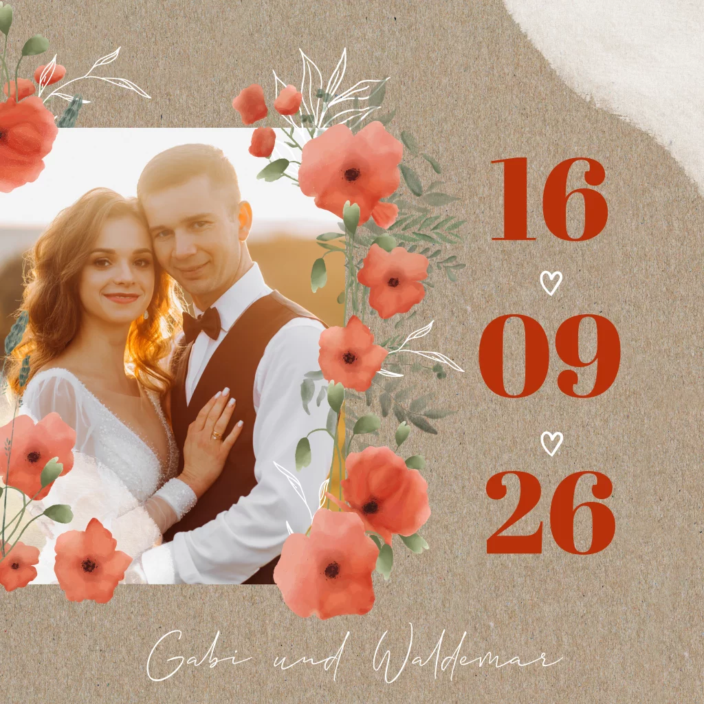 Diese romantische Hochzeitskarte mit filigraner Schrift und roten Mohnblumen ist ein Hingucker für die Hochzeitsgäste. Das quadratische Format der Karte bietet ausreichend Platz für Text und Fotos. Das Design ist in einem Kraftpapierlook gestaltet. Den Druck empfehlen wir auf Naturkarton.