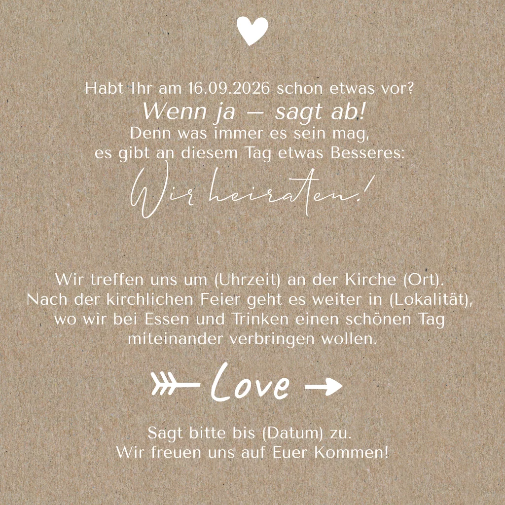Ladet Eure Hochzeitsgäste mit dieser quadratischen Kraftpapierlook-Karte im Skandi Stil zu Eurem großen Fest ein. Eure Gäste können einfach nur ja! sagen. Wir raten bei diesem Design zu einem Druck auf Naturkarton.