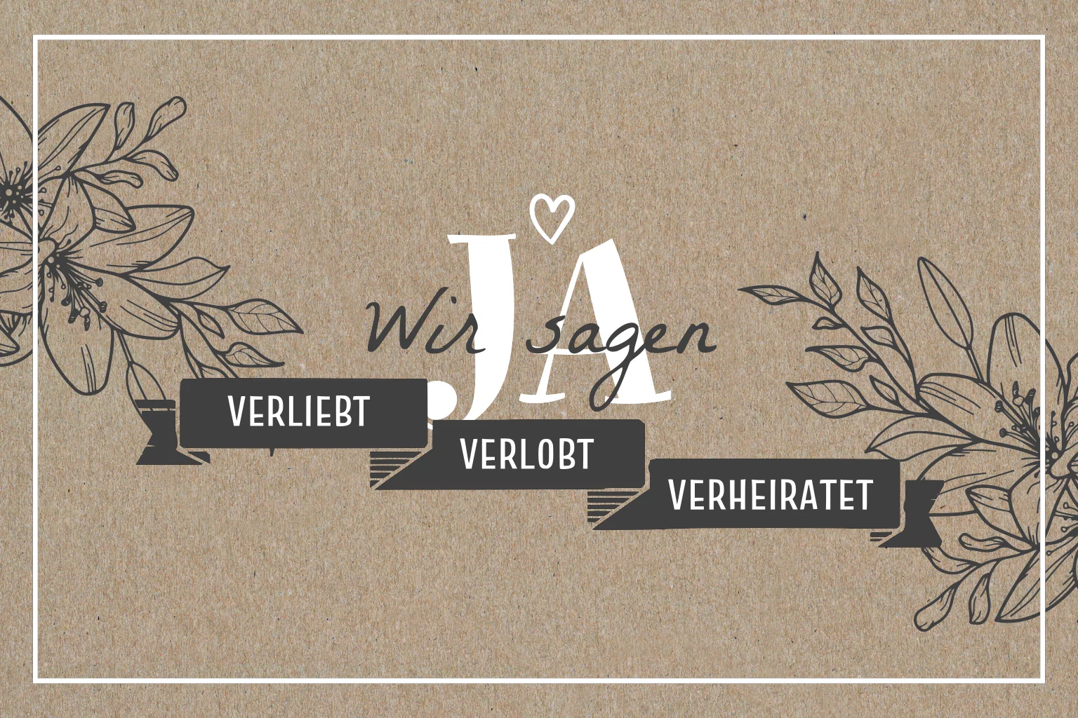 Florale Einladung zur Hochzeit aus Kraftpapier mit Rahmen und Bannern. Durch die zarten Blumen in Line Art wirkt die Karte sehr edel. Auf der Rückseite ist Platz für Euer Verlobungsfoto und Text.