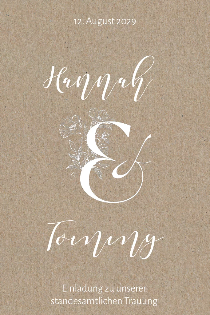 Einladung zur standesamtlichen Trauung aus Kraftpapier mit Und-Zeichen und Blumen in weiß.