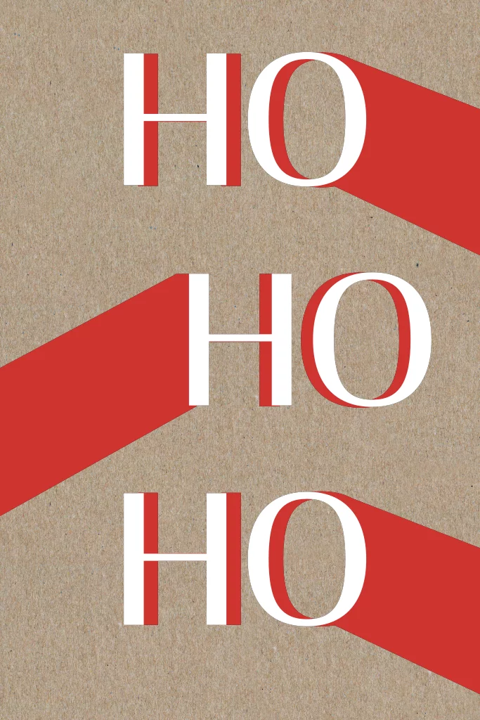 Grafische "HoHoHo" Einladungskarte zur Hochzeit aus Kraftpapier in rot und weiß im Postkartenformat.