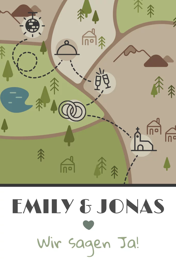 Diese Einladung zur Hochzeit ist einmal etwas ganz anderes. Im Stil einer Landkarte wird der Tagesablauf der Hochzeit durch eine Timeline mit Icons lustig dargestellt.