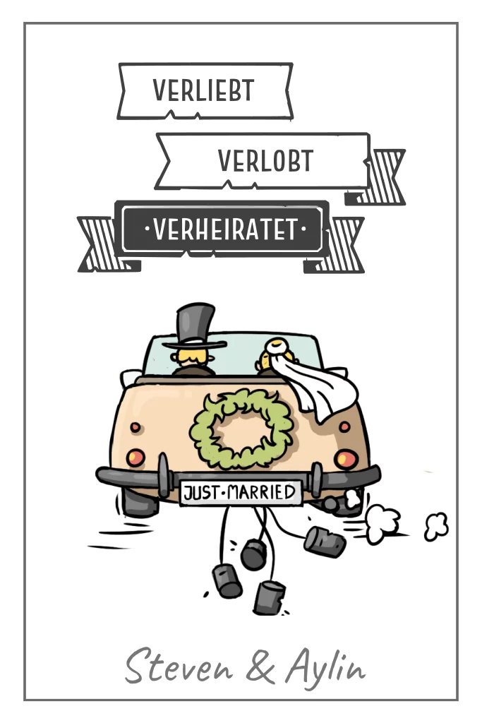 Lustige Hochzeitskarte mit Auto und Brautpaar im Comic-Stil