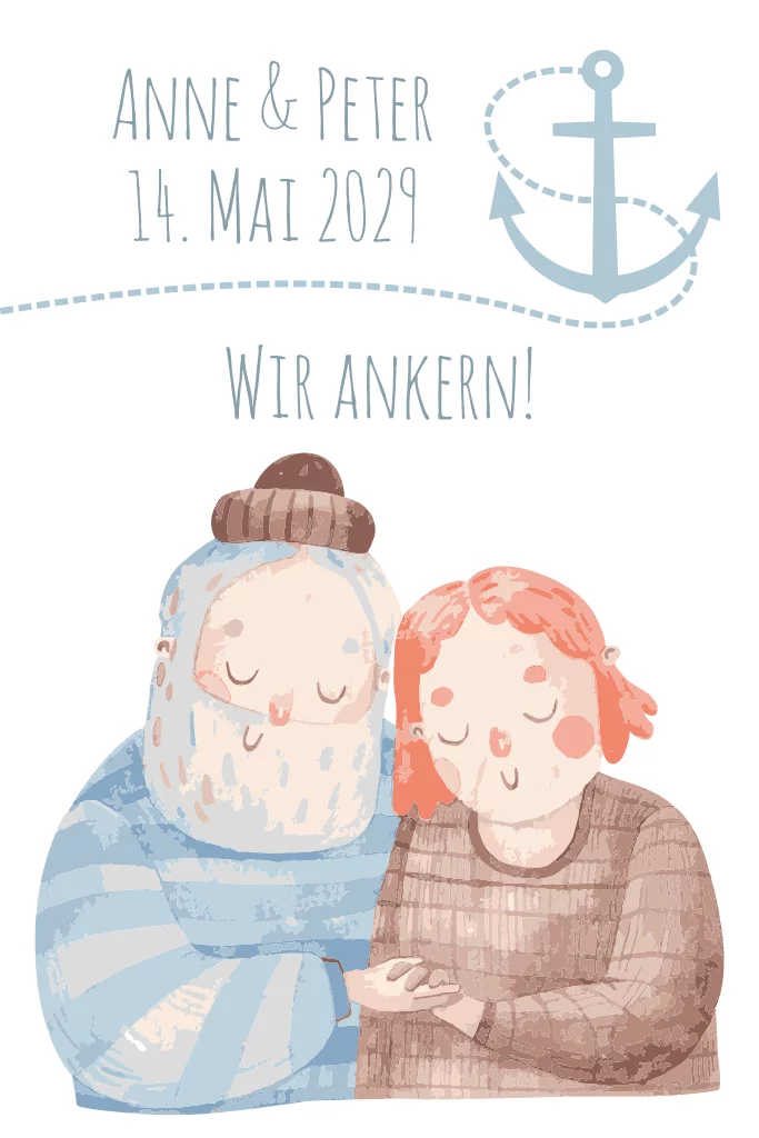 Maritime Einladung zur Hochzeit mit Paar Illustration und blauem Anker