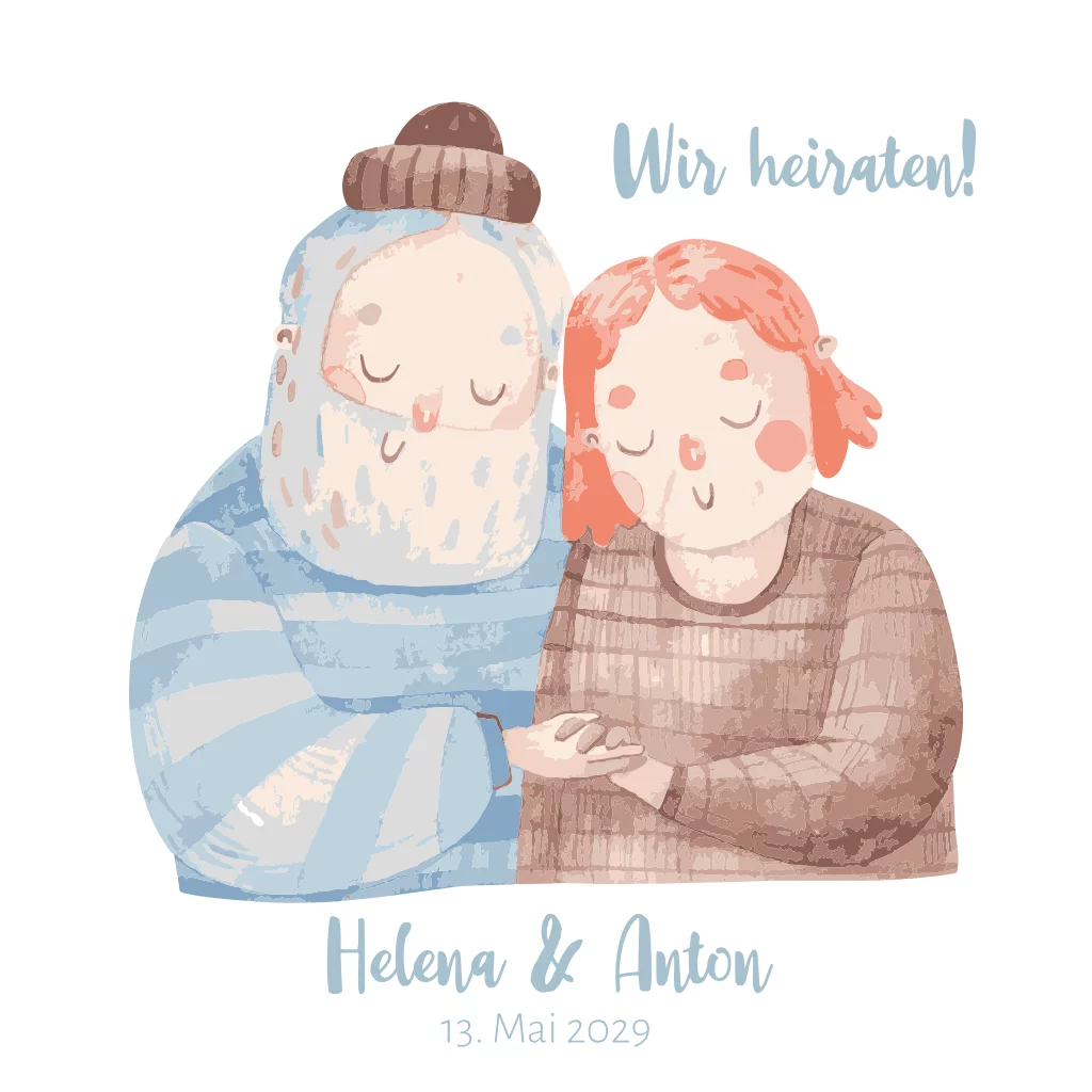 Weiße Einladungskarte zur Hochzeit mit süßem hanseatischen Pärchen. Die quadratische Karte mit blauen Akzenten ist auf der Rückseite sehr schlicht gehalten.