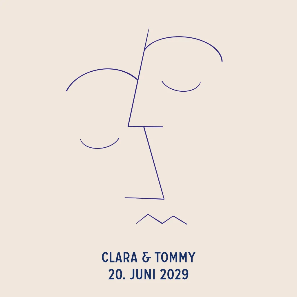 Einladungskarte zur Hochzeit mit abstrakter Paar-Zeichnung in Blau. Die quadratische Karte in beige mit Line Art Design bietet Platz für Euren Einladungstext auf der Rückseite der Karte.