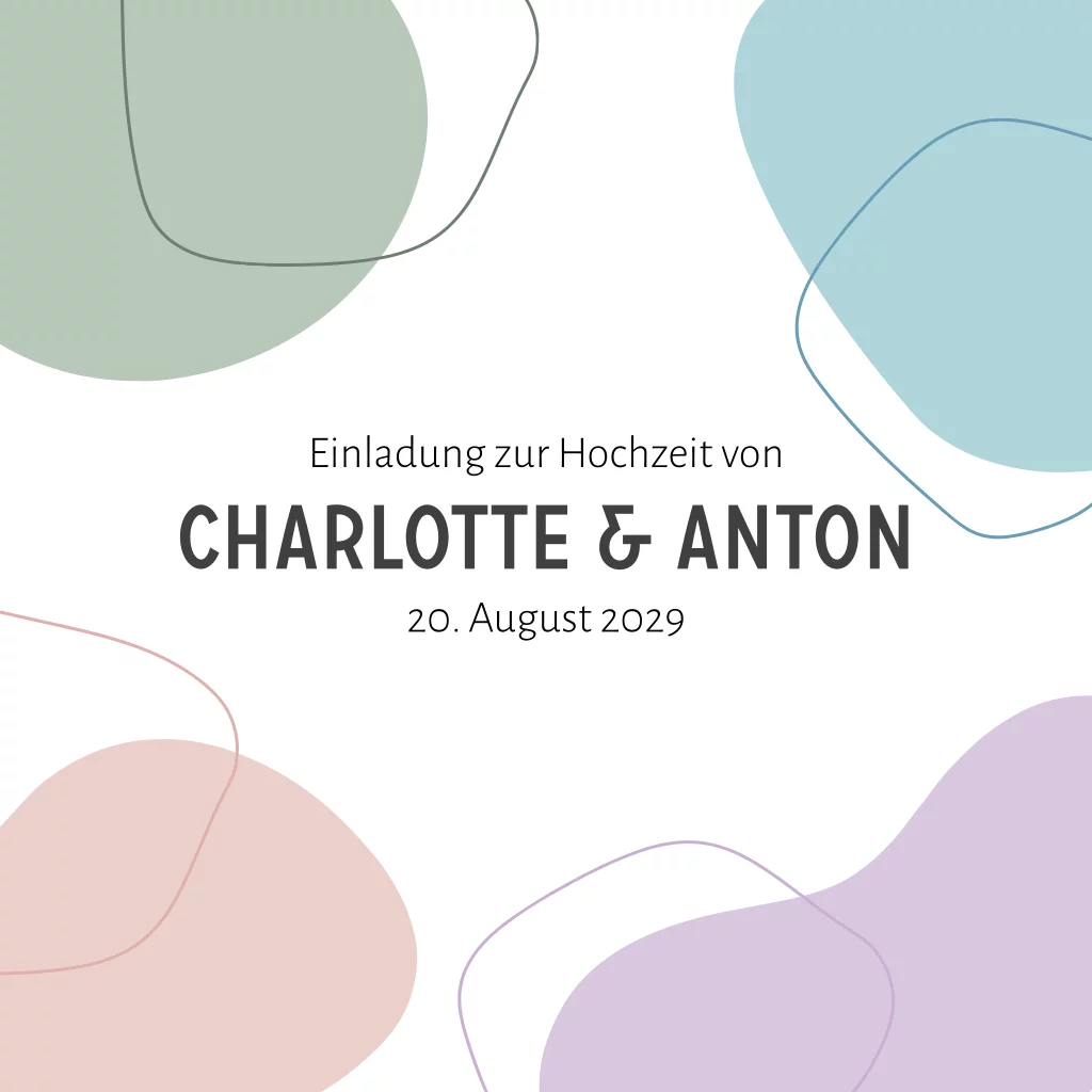 Quadratische Einladung zur Hochzeit mit organischen, bunten Formen. Die Karte ist weiß und hat zarte Linien passenden zu den farbigen Elementen.