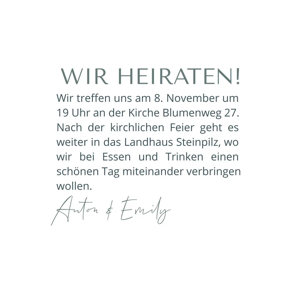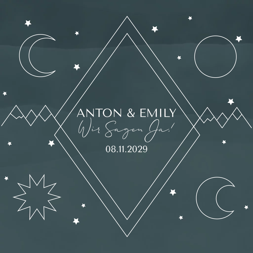 Quadratische Einladung zur Hochzeit mit modernen grafischen Elementen und Bergen und Monden in Goldfolierung. Die Klappkarte in dunklem Grün bietet ausreichend Platz für Euren Text und sogar Fotos.