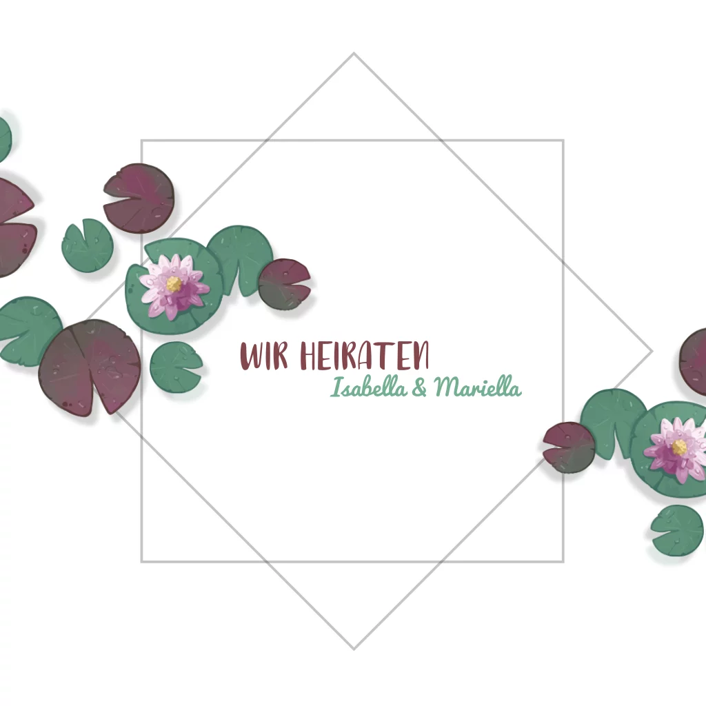 Einladung zur Hochzeit mit modernen Formen und Seerosen in grün + lila