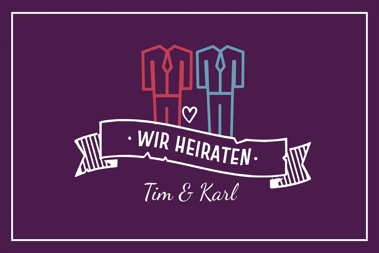 Diese moderne Einladung zur Hochzeit als Klappkarte in lila mit weißem Rahmen und Banner eignet sich perfekt für eine gleichgeschlechtliche Eheschließung. Schließlich bilden die 2 Anzug Icons das Highlight der Karte.