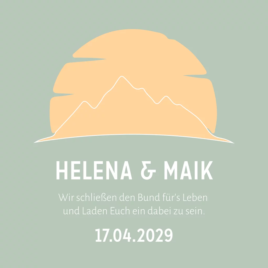 Moderne Hochzeitskarte in grün mit Sonne und Berge Motiv in gelb