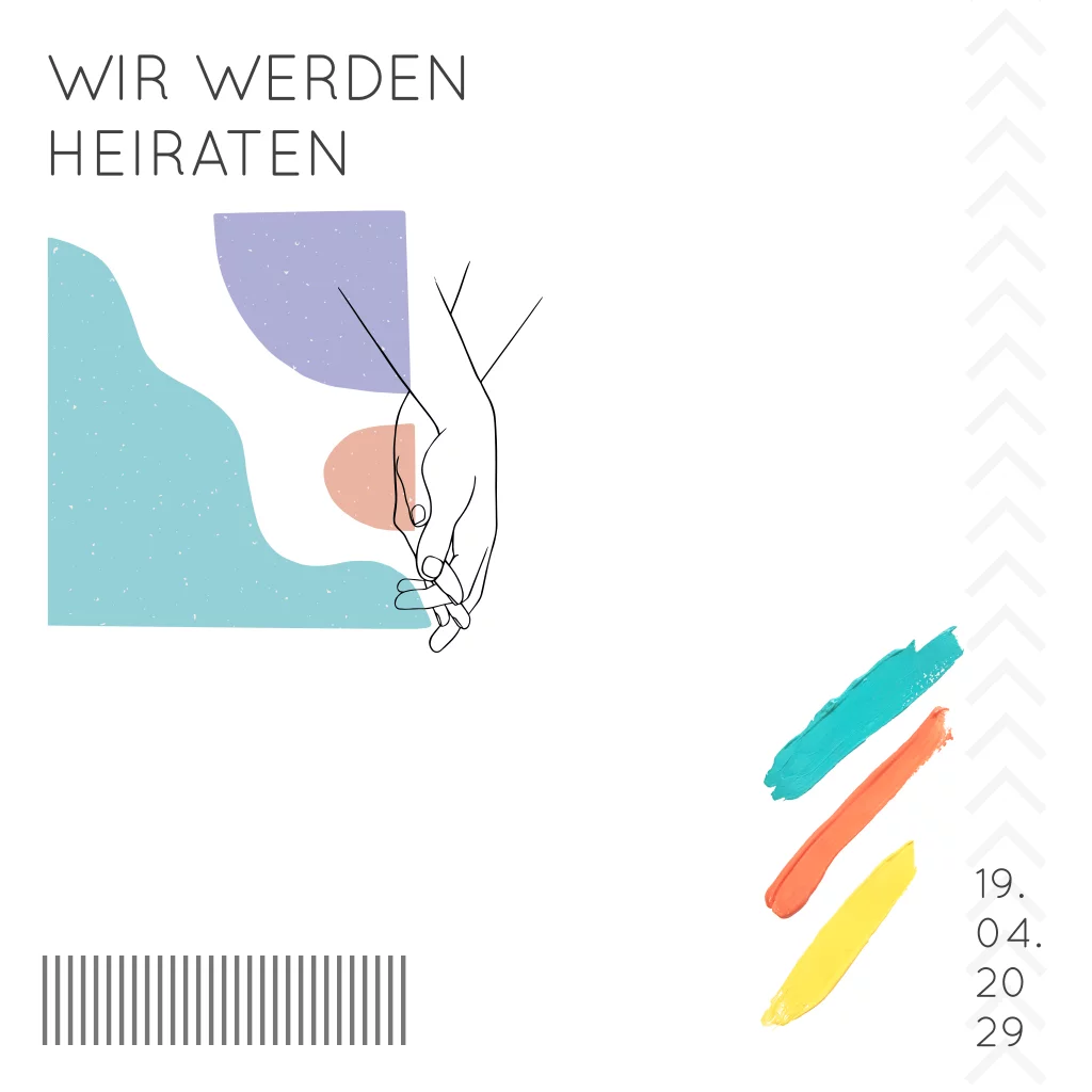 Moderne Einladung zur Hochzeit mit bunten Pinselstrichen + Zeichnungen