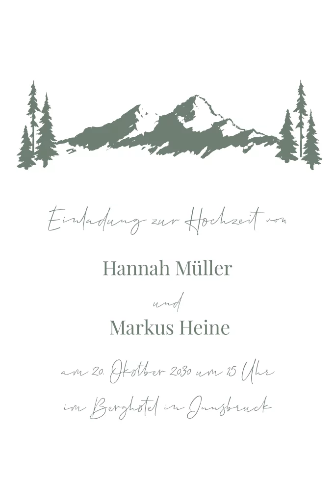 Naturkarte Einladung zur Hochzeit in grün und weiß mit Timetable, Bergen und Tannen.
