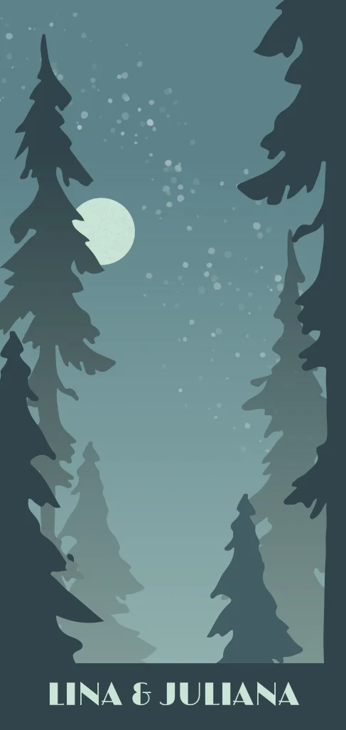 Einladungskarte zur Hochzeit mit Naturpanorama, Sternenhimmel und Tannen in Blau.