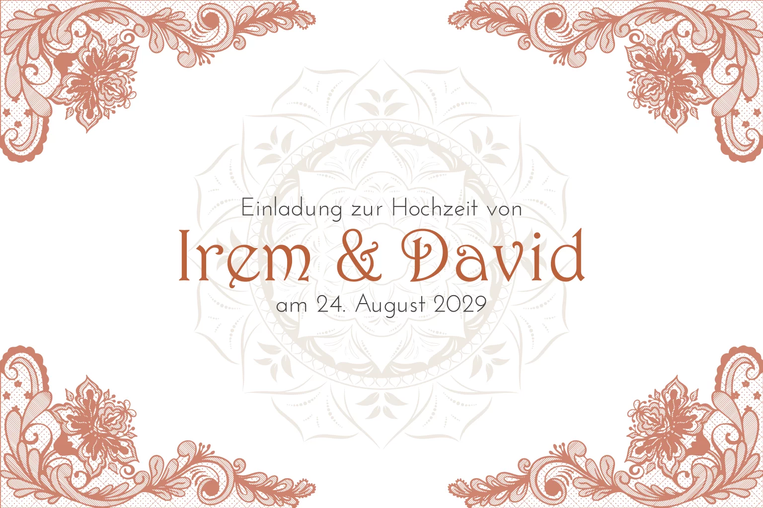 Orientalische Einladung zur Hochzeit in weiß. Die Postkarte ist mit Spitze in orange und Mandala in beige verziert.