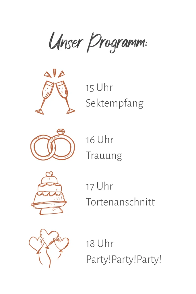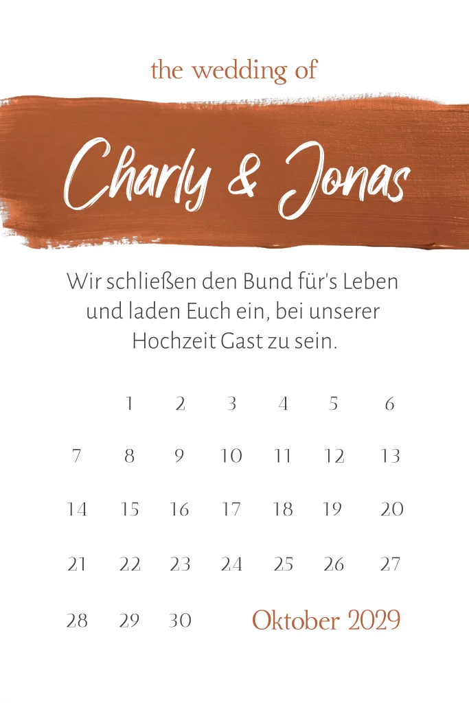 Weiße Einladungskarte zur Hochzeit mit Kalenderblatt und Rostbraunem Pinselstrich auf der Vorderseite. Die Klappkarte hat im Innenteil eine Timeline mit Hochzeits-Icons, wie z.B. einer Torte.