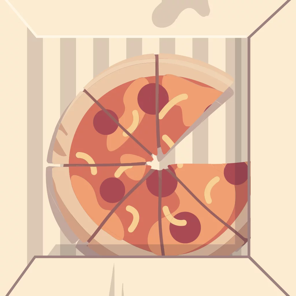 Quadratische Einladungskarte als Pizzakarton. Die Vorderseite mit roten Streifen stellt den Deckel der Pizzapackung da. Im Innenteil der Karte befindet sich die Pizza. Diese lustige Klappkarte ist die beste Einladung zur Hochzeit für alle Pizzalover.
