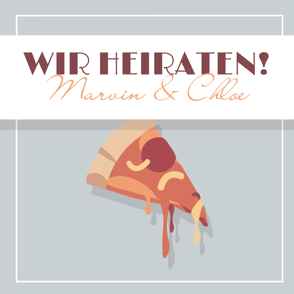 Quadratische Klappkarte in grau als Einladung zur Hochzeit mit einem Pizzastück auf der Vorderseite. Die lustige Karte hat eine ausgefallenen Art, um Eure Gäste einzuladen.