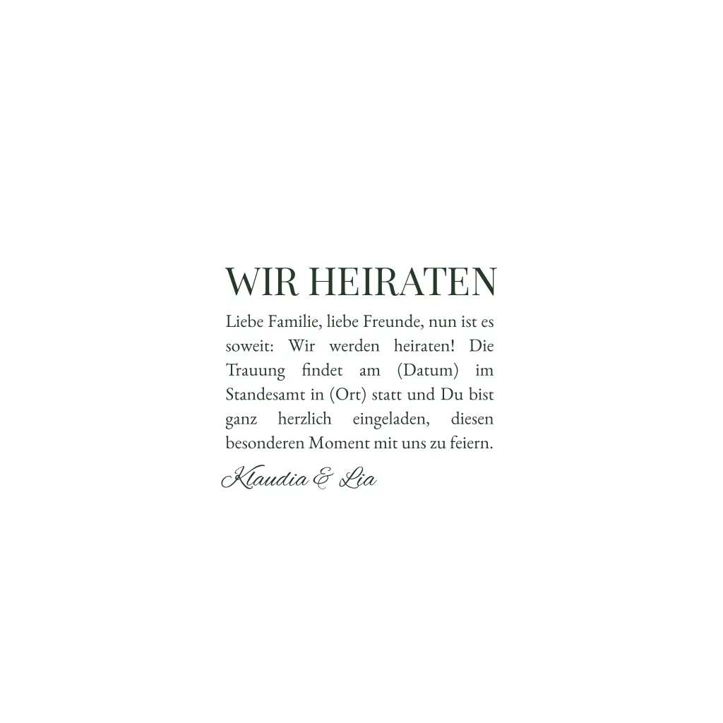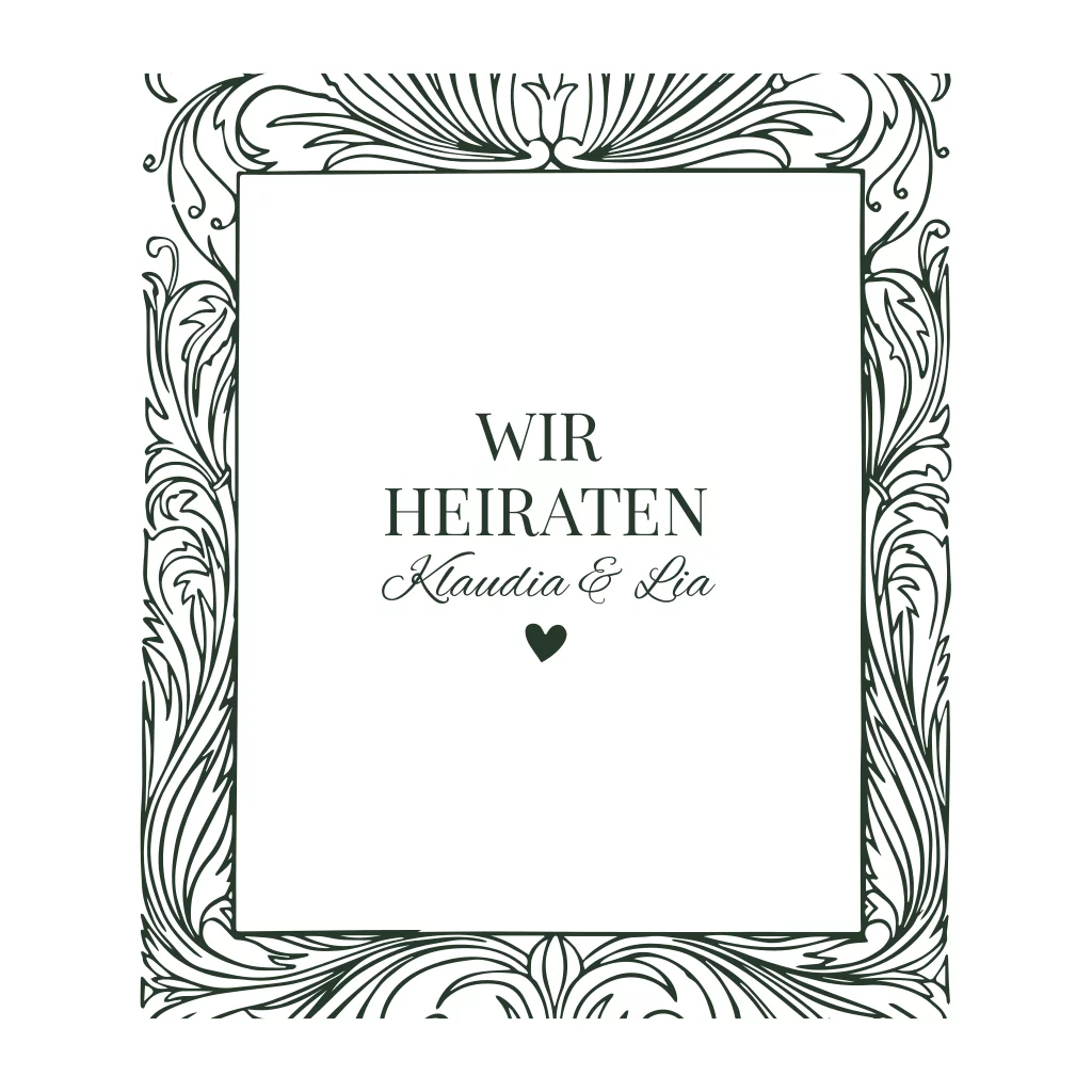 Quadratische weiße Hochzeitseinladung mit grünen floralem Rahmen. Die klassische Klappkarte hat im Innenteil Platz für Euer Verlobungsfoto.