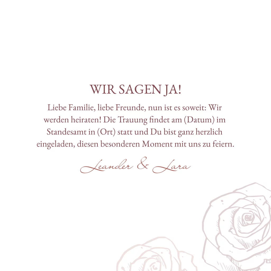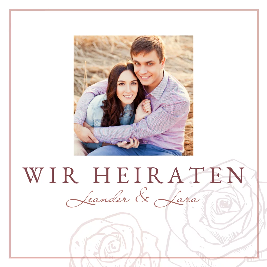 Quadratische Hochzeitseinladung mit Rahmen, Foto, Rosen und Kalender