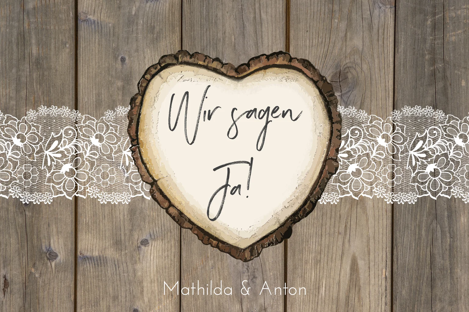 Rustikale Einladung zur Hochzeit in Holzoptik weißer Spitze und Herz