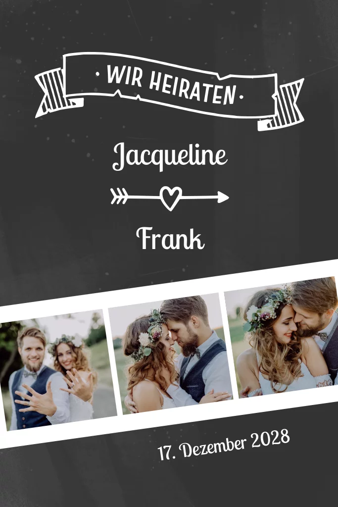 Hochzeitskarte im Schiefertafel Look mit Fotostreifen und Banner als Postkarte im Hochformat.